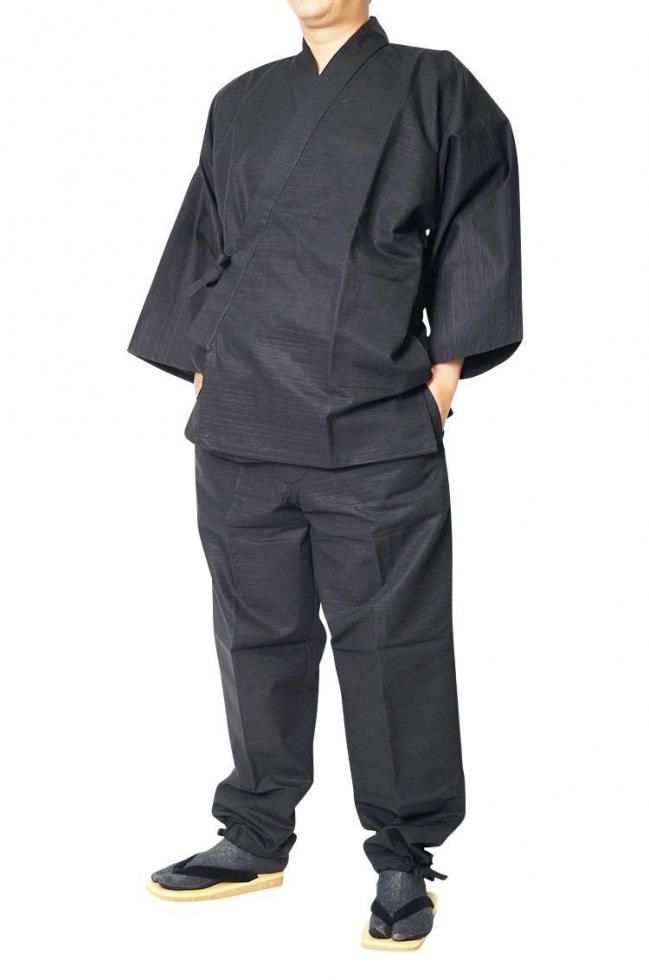 作務衣 メンズ 夏 作務衣しじら織り さむえ 綿100% 黒ストライプ襟レース オリジナル S-7L